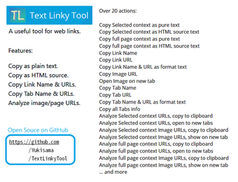 텍스트 링크 도구는 웹 링크 및 콘텐츠 관리를 향상시키기 위해 설계된 Firefox 확장 프로그램입니다. 이 개인화 도구는 사용자가 일반 텍스트 및 HTML 소스를 포함한 다양한 형식으로 텍스트를 복사할 수 있도록 합니다. 20개 이상의 다양한 작업을 통해 링크, 탭 및 이미지를 원활하게 처리할 수 있는 광범위한 기능을 제공합니다. 사용자는 선택한 콘텐츠를 쉽게 분석하고 복사하거나 이미지를 새 탭에서 열거나 여러 탭에서 동시에 정보를 추출할 수 있습니다.